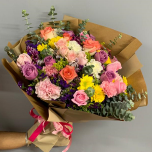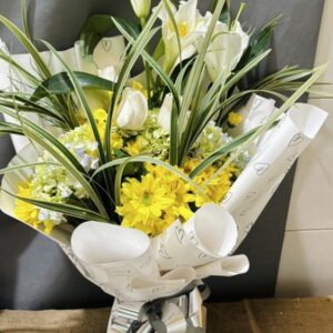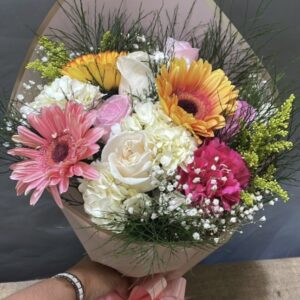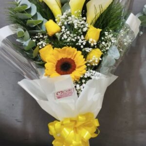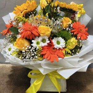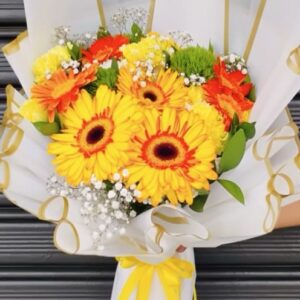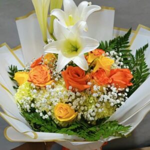 Ramillete de flores mixtas compuesto por 8 gerberas, hortencias y azucenas , envuelto en papel celofán, con globo del motivo de su preferencia y bombones st moritz