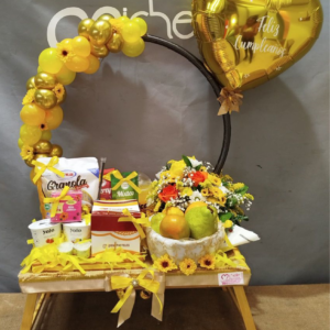 Arreglo de flores mixtas y exóticas elaborado en cesta grande con globos edad y metalizados de 18″, de los cuales 1 será personalizado con el mensaje que usted desee, indicando también la edad del cumpleañero(a).