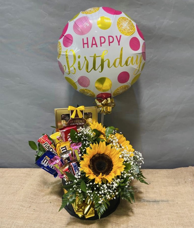 Caja de 3 girasoles con dulces surtidos, una caja de 12 bombones Ferrero Rocher, y globo de 18”.