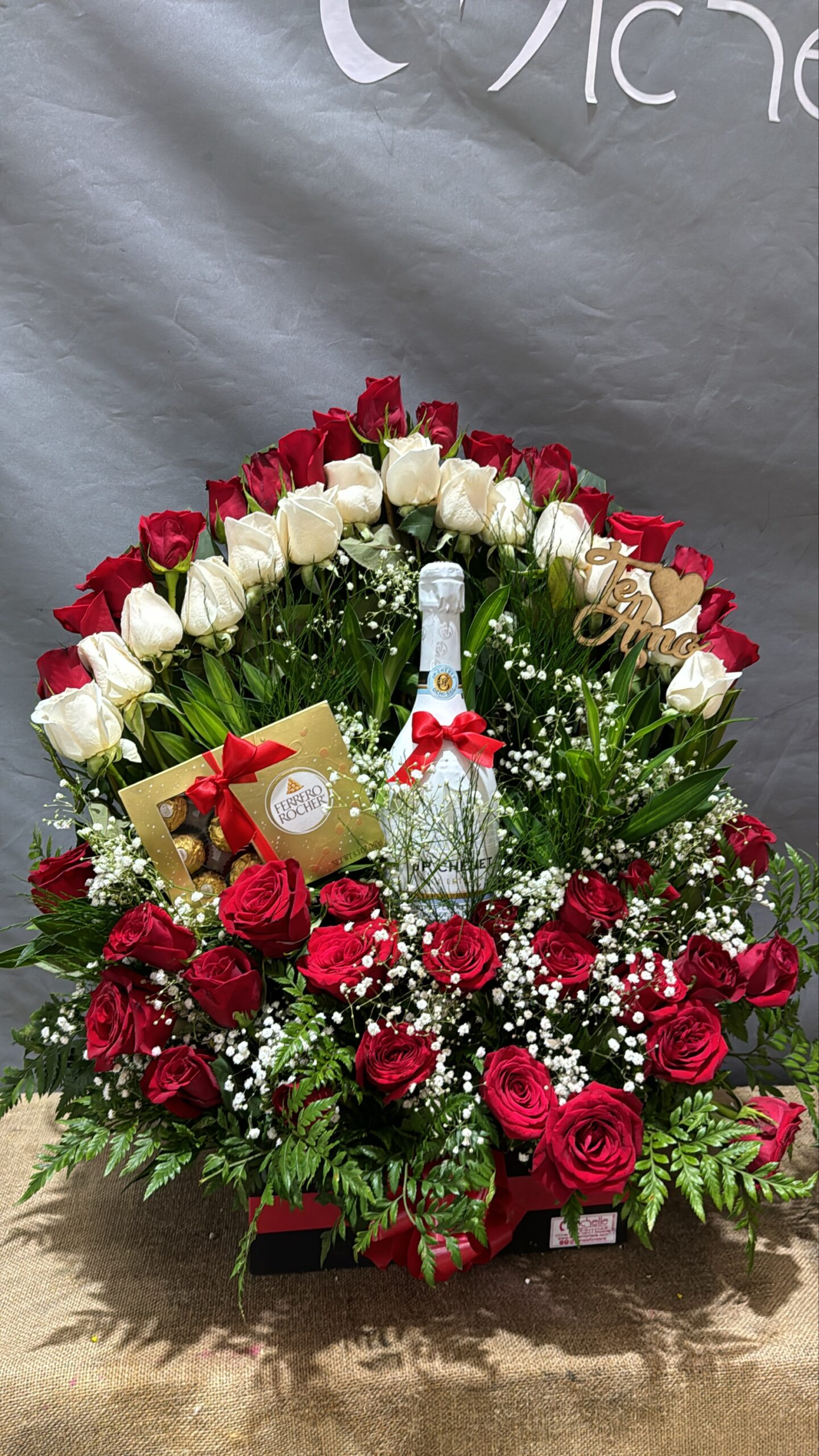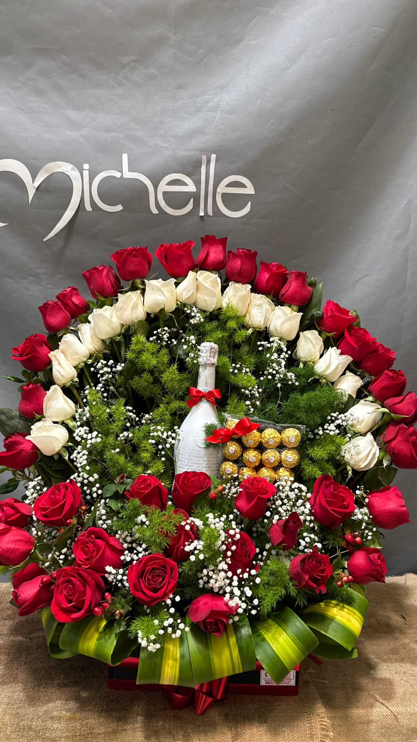 Arreglo en forma de abanico de 50 rosas con botella de champán JP Chenet, caja de bombones Ferrero Rocher de 12 unidades y topper.