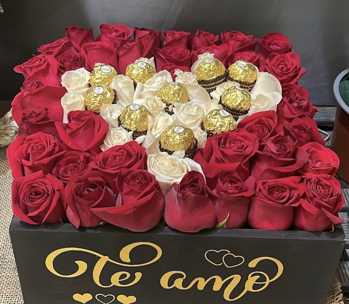 Caja rectangular de 60 rosas creando un corazón en el centro, acompañado de 10 bombones Ferrero Rocher.