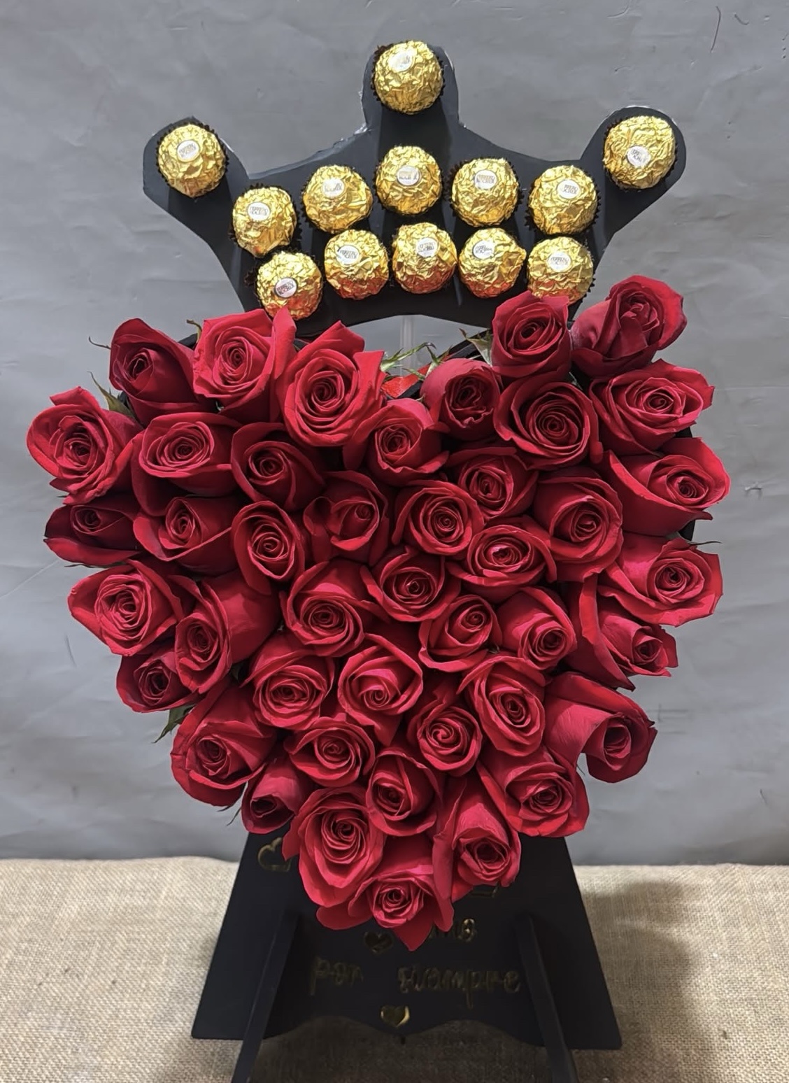 Corazón de rosas en Pedestal y corona con bombones Ferrero Rocher.