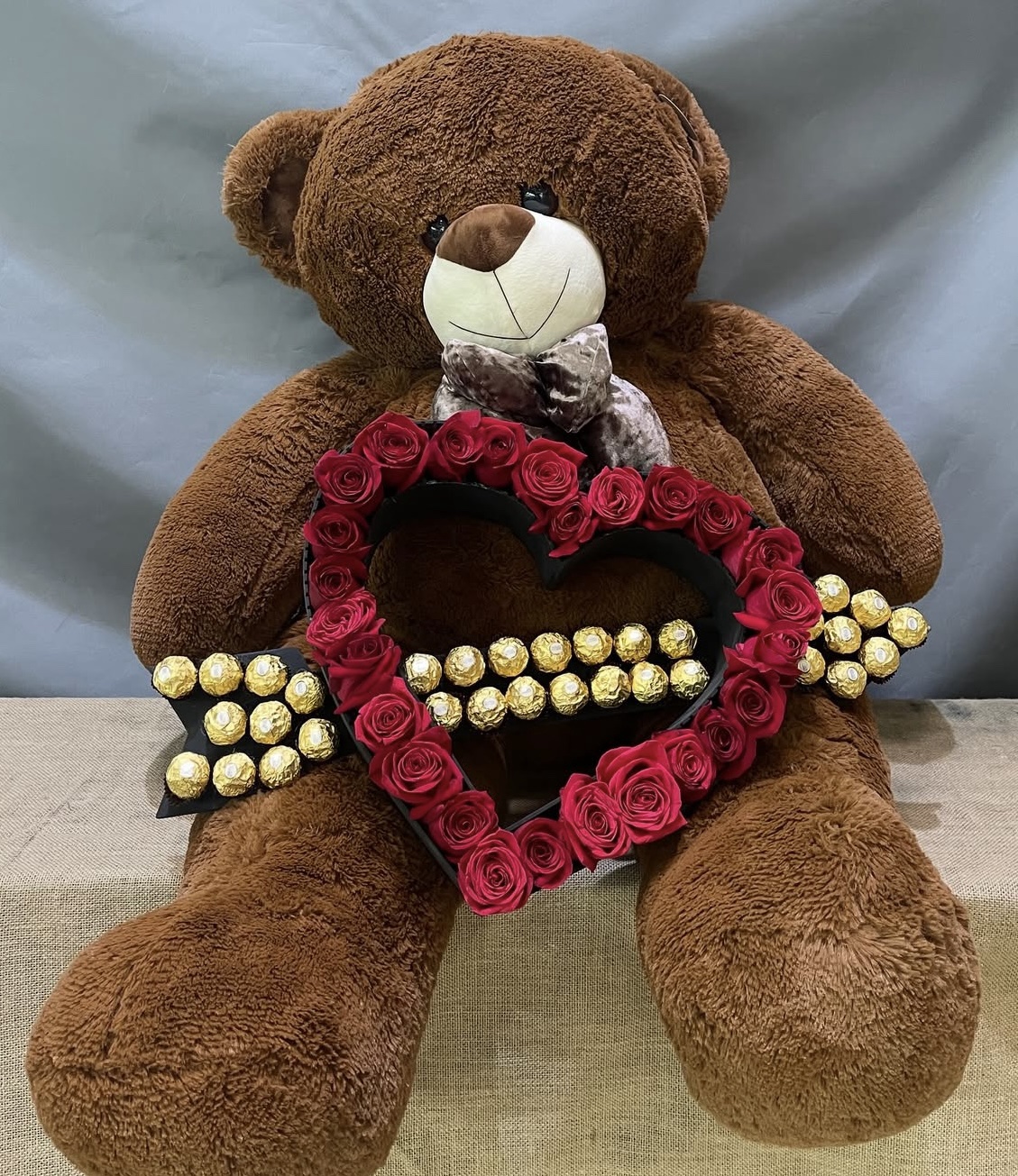 Oso de 1.30 metros con arreglo de corazón flechado de 26 rosas y 32 bombones Ferrero Rocher.