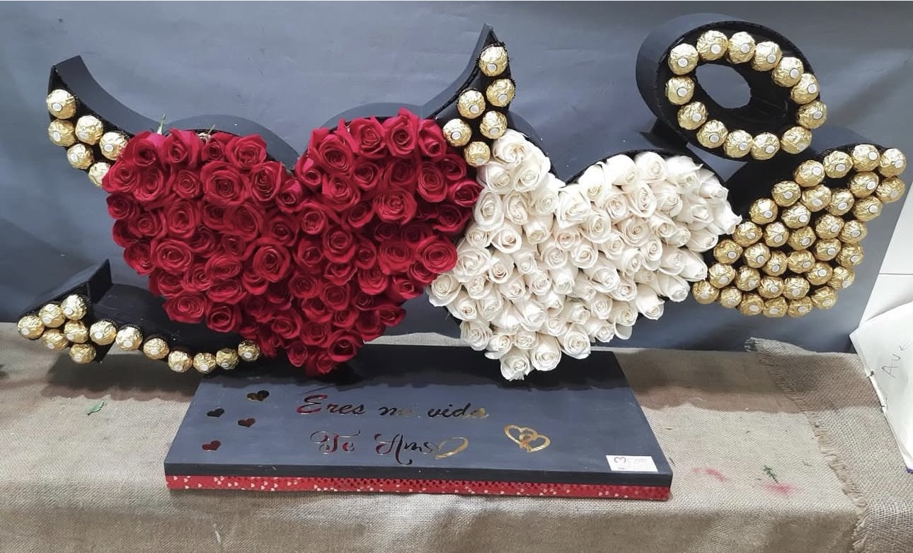 Corazones de Ángel y Demonio con un total de 140 rosas y 67 bombones Ferrero Rocher.