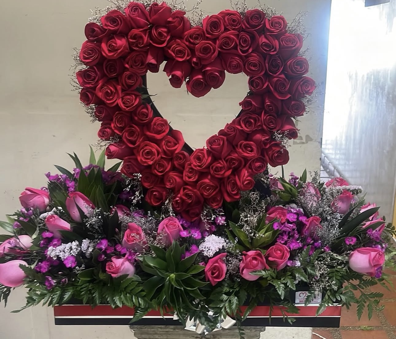 Espectacular corazón abierto de 100 rosas sobre jardín de 24 rosas.