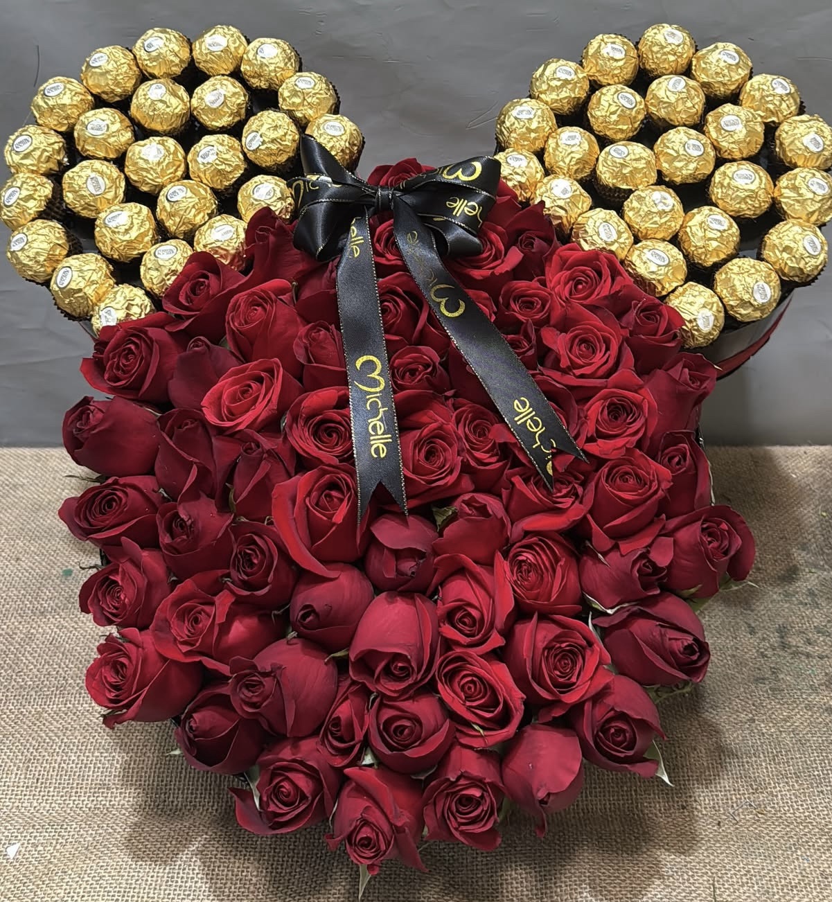 Caja con forma de Mickey/Minnie con 42 rosas y 48 bombones Ferrero Rocher.