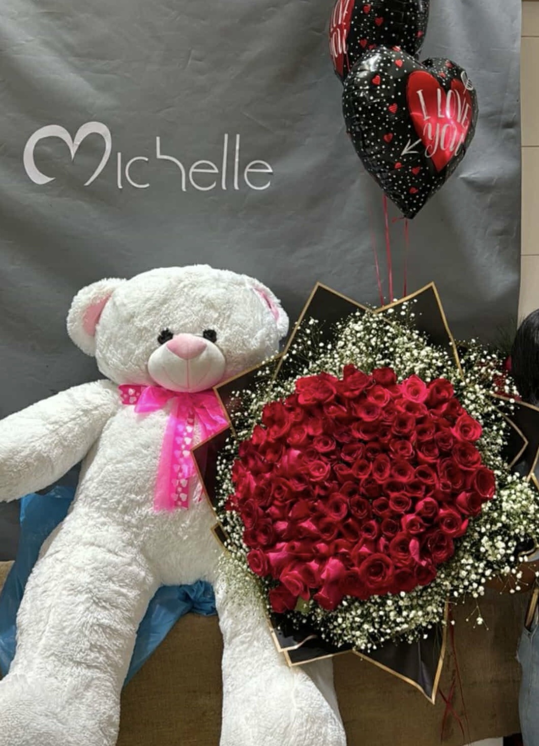 Oso de peluche de 1.30 metros con ramillete de 100 Rosas y 3 globos con helio.