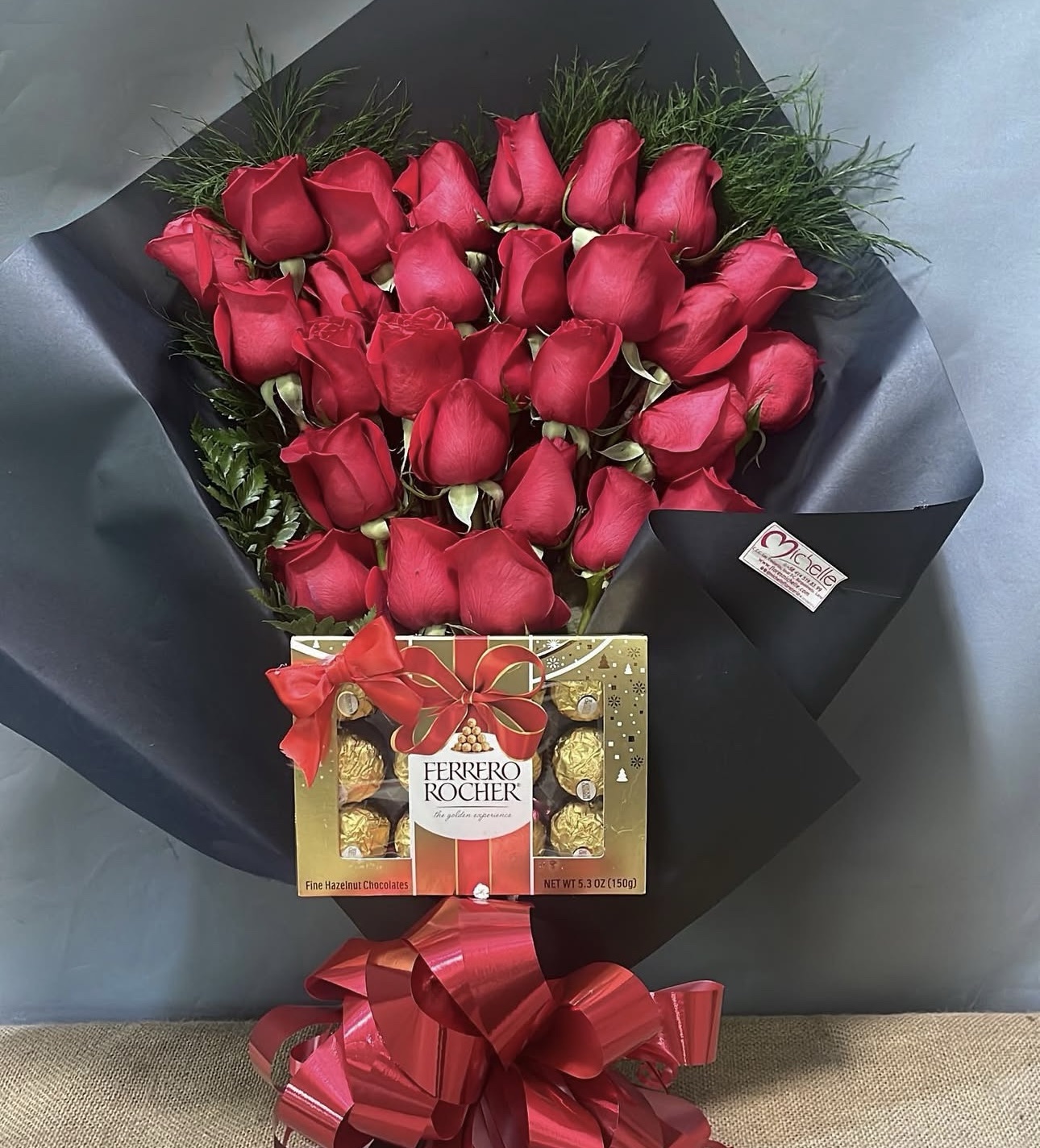 Ramillete acostado de 30 rosas con caja de bombones Ferrero Rocher (12uds).