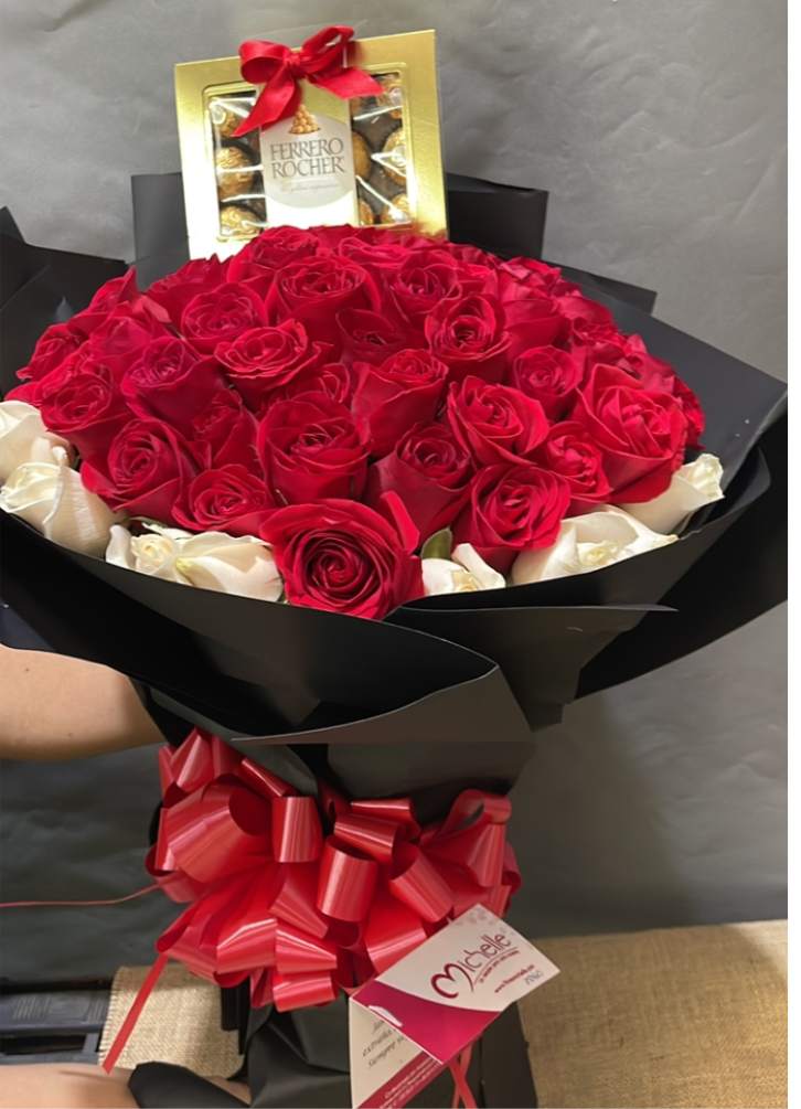 Ramillete de 60 rosas y caja de 12 bombones Ferrero Rocher.