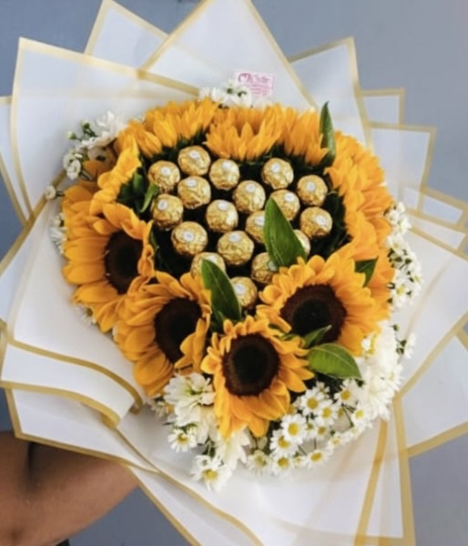Ramillete de 12 girasoles con corazón en el centro de 18 bombones.