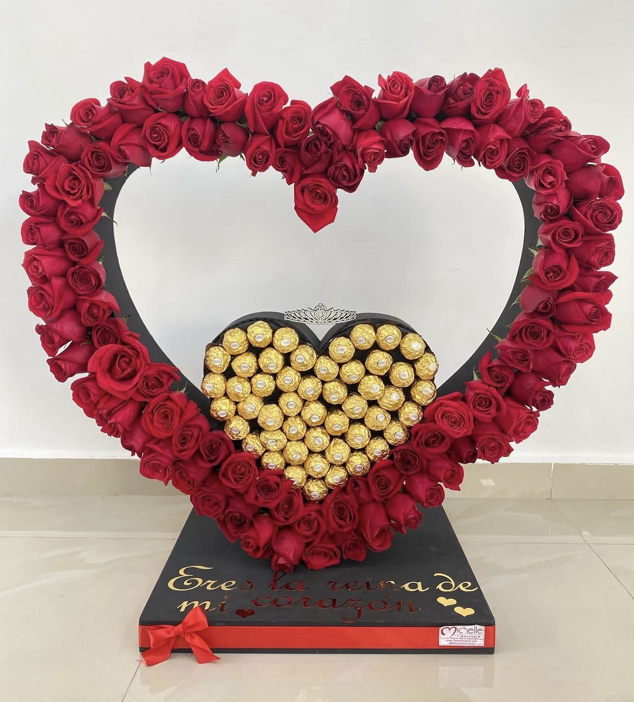 Hermoso corazón de 100 rosas naturales con corazón central de 50 bombones Ferrero Rocher, mini corona de fantasía y rotulado en base; Eres la reina de mi corazón.
