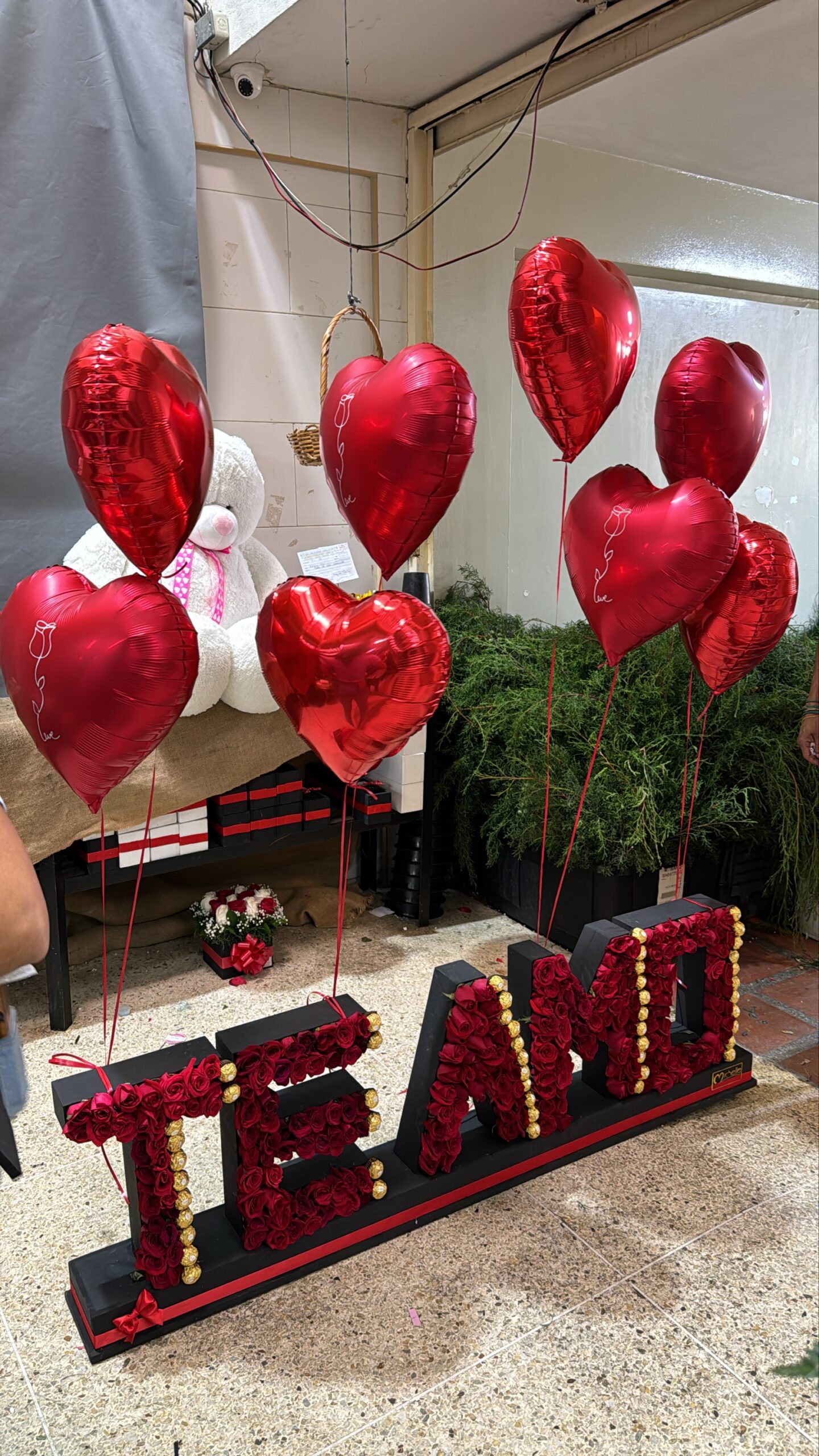 Frase “Te Amo” de Rosas con bombones Ferrero Rocher con letras de 35cm de alto, acompaƱadas de 8 globos con helio.