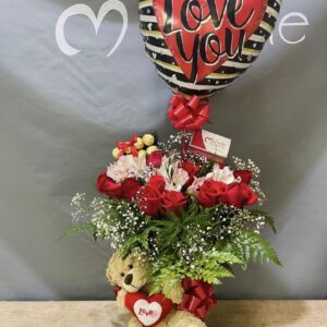 Arreglo mixto elaborado en florero de vidrio más peluche de osito, 1 caja de bombones Ferrero Rocher de 12 unidades y 1 botella de vino merlot